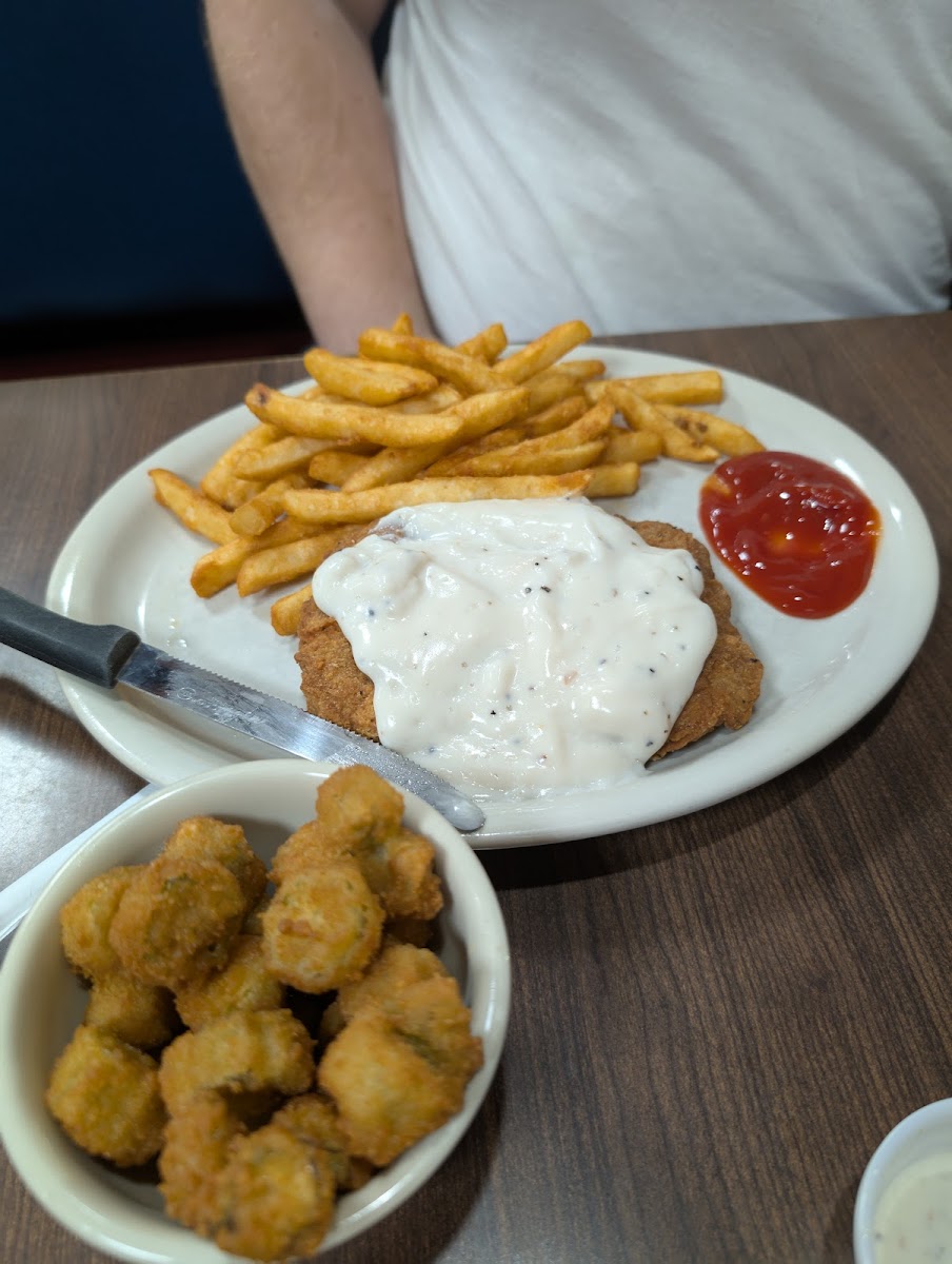 This place was great! I didn't know why they were dead, especially when everyone else was packed. Then, one of the staff (manager?) said they had a string of bad wait staff, and said they were afraid the damage was done. Well, not if my moderately famous reviews have anything to say about it! We got out of there after an appetizer and two huge entrees, plus %25 tip for $50. That was a great value for all the food. We got the fried mushrooms to start. Dunno if they were frozen or house, but they were fried fresh and crispy, served with ranch. Hard to screw up. The real prize was the entrees. My husband got the chicken fried steak dinner, which came with rolls, a salad, and fries. The portions were Oklahoma proud and everything was delicious. I had the Perry burger, which was their variation of a Western Bacon cheeseburger (grilled onions, not fried onion rings,) and fries. All of it was banging. Ate ourselves silly. The staff was friendly. Struck up a conversation about dispensary preferences. Then I head of the tragedy that was the damage to this place's reputation. So come see em. The decor is very late 80's early 90's Americana. There's a good patina on the whole place, letting you know they've been doing this for decades. Don't let it end now! Thanks, Perry's!