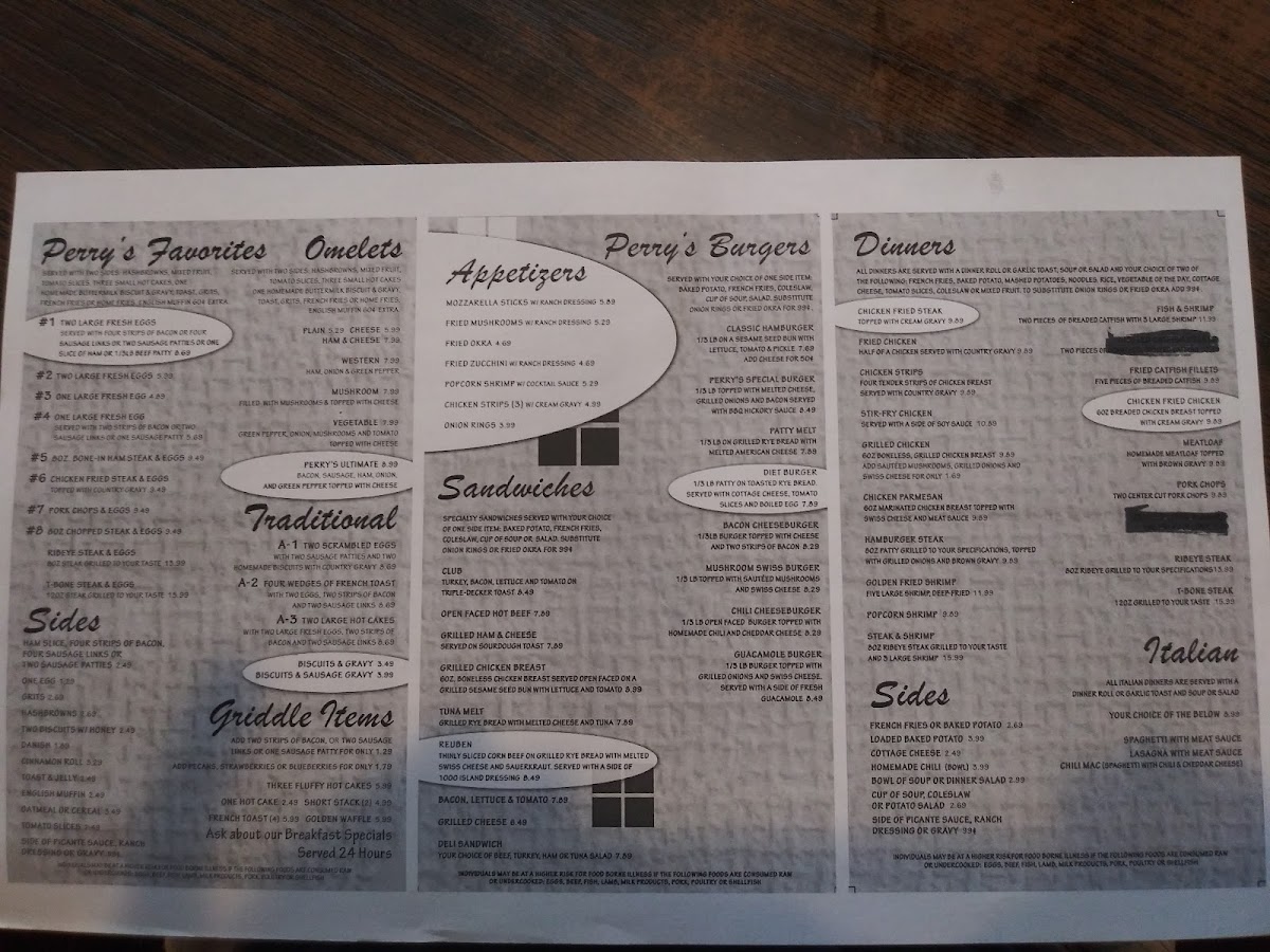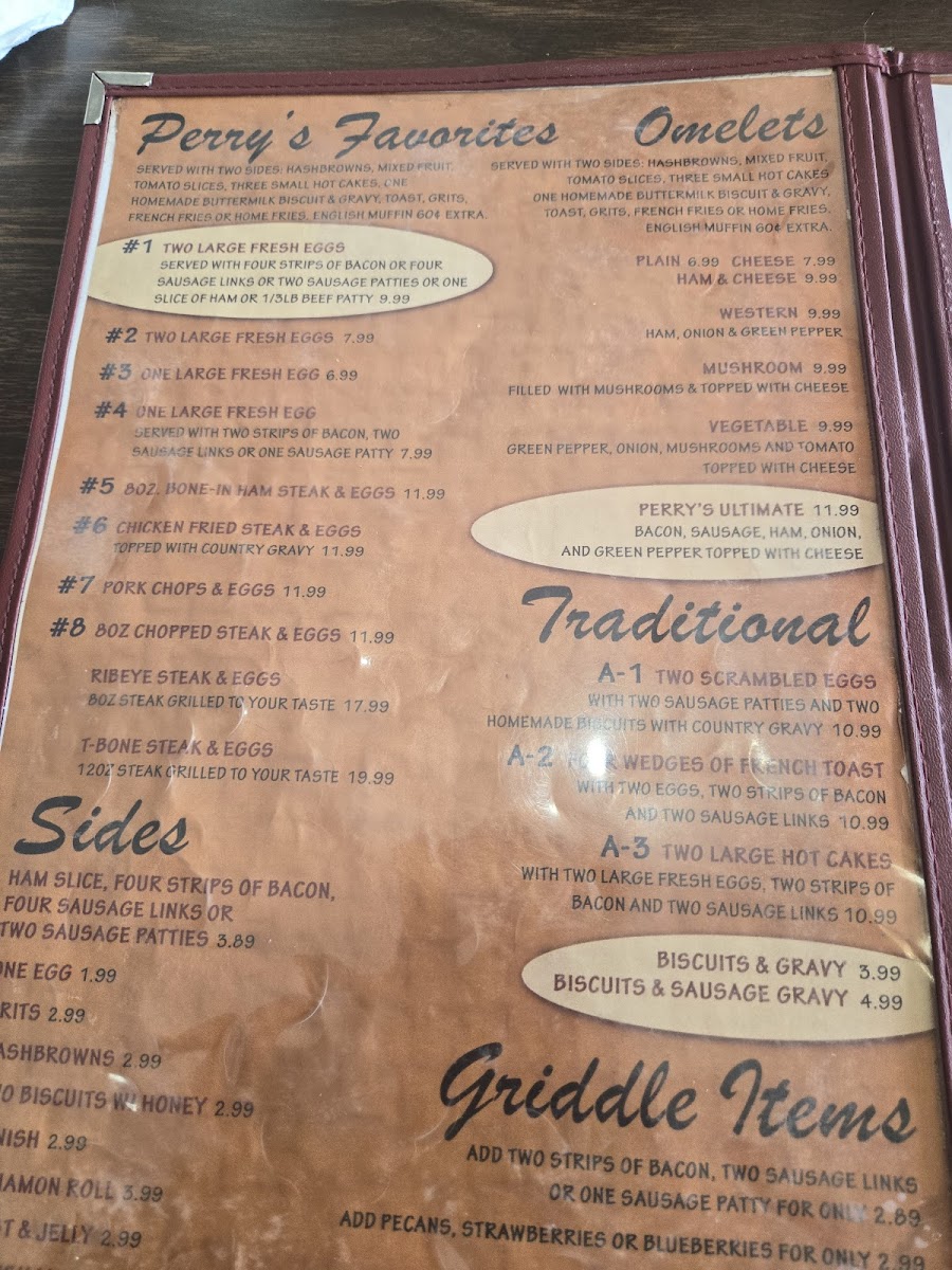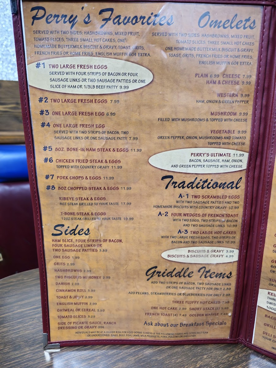 The menu at Perry's Restaurant presents a straightforward, comforting selection rooted in classic American breakfast and diner-style fare. It brings together familiar favorites designed for mornings, casual lunches, or anytime a satisfying, hearty meal is desired.